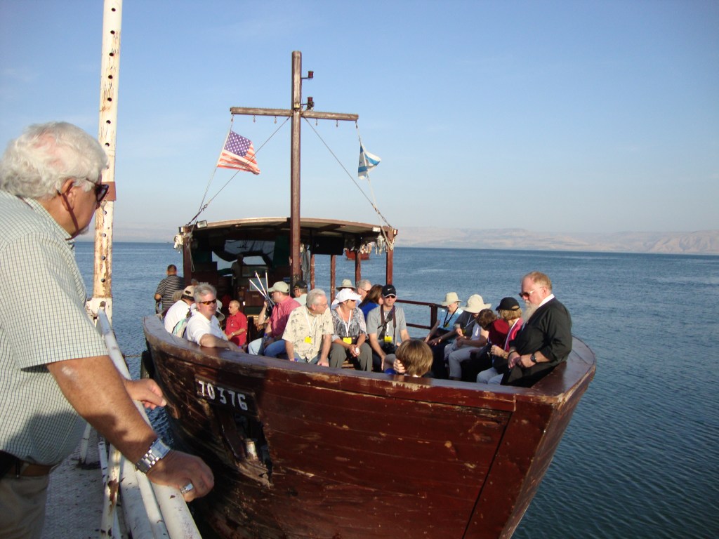 Tour boat with pilgrims from the US pull up to dock on the Sea of Galilee