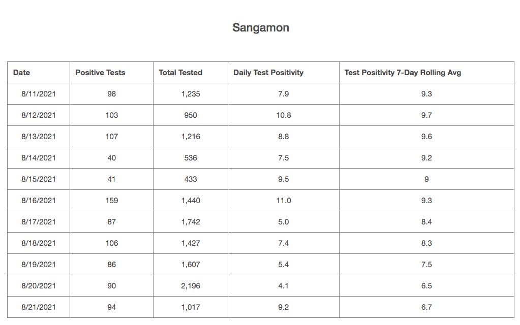 On the other hand, it could be worse. Our local metrics of community spread are significantly higher than in Chicago and the suburbs, but nowhere near as bad as Missouri and the “red states” to the South where the pandemic has been so heavily politicized. And maybe — hopefully, cross your fingers! — we’re beginning to flatten the curve a little. Here’s one measure, for Sangamon County: