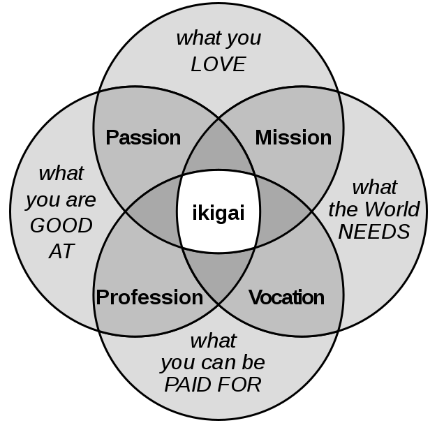 Ikigai seems to be chiefly known in the West as a Japanese management and human resources concept, and it’s a useful way of thinking through conundrums in life and making midcourse corrections as needed. But there’s more to it than that, and I think it can be quite powerful.