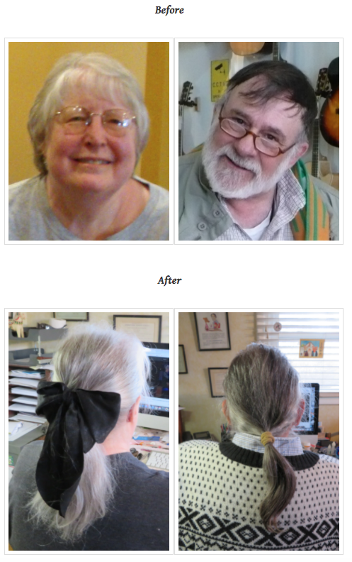 Among other pandemic activities, we’ve been growing ponytails. My hair hasn’t been this long since high school, and Pete’s wasn’t this long even during his hippie stage. Now that our hair has grown out, we’ve both decided we kind of like it that way. We can just stick it in a ponytail on bad hair days instead of having to fuss with it. Check out our “before” and “after” photos below.