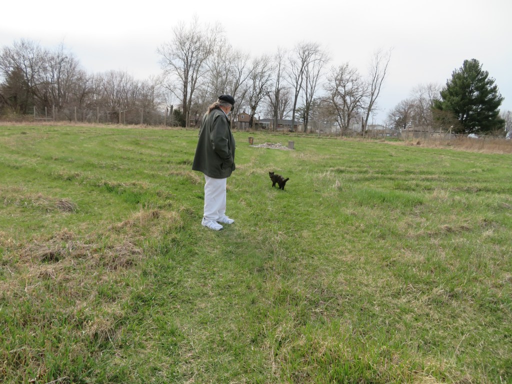 Amiga is a graduate of the Animal Protective League’s barn cat program — her ear is clipped like a feral’s — but she lives up to her name. She’s friendly, with that kind of wary caution you so often see in rescue kitties. She tagged along with us as we explored the 164-acre tract, mostly grassland with well defined trails in gently rolling terrain that slopes down to Archer Creek just to the east. At times she led the way. After all, it’s her farm! And I was reminded a little of Dante’s Beatrice, his guide through Purgatory into Paradise in the Divine Comedy. The picture below shows Amiga leading me into the entrance of a labyrinth on the farm (my ponytail is the product of two years without a haircut during the pandemic).