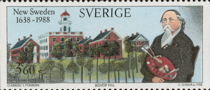 Founded in 1846 by Swedish religious dissidents, the colony attracted other settlers from Sweden to west central Illinois and became an early focal point for Swedish immigration. It is better known in Sweden, perhaps, than it is in the United States. And in 1988, the 350th anniversary of Swedish emigration to America, the Swedish postal service issued a commemorative stamp (shown at the top of this page) featuring several colony buildings and a self-portrait of Olof Krans. It’s quite a piece of art, too, by engraver Czeslaw Slania of Poland and Sweden.