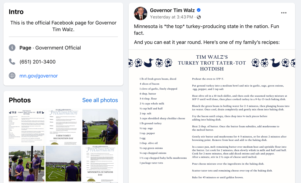 So the “Turkey Trot Tater Tot hotdish Gov. Walz shared to Facebook checks the boxes. Ground turkey for the meat, check. Tater Tots for starch, check. (Tater Tots, by the way, is a registered trademark for the processed potatoes produced by a subsidiary of Kraft Heinz.) And green beans, check.