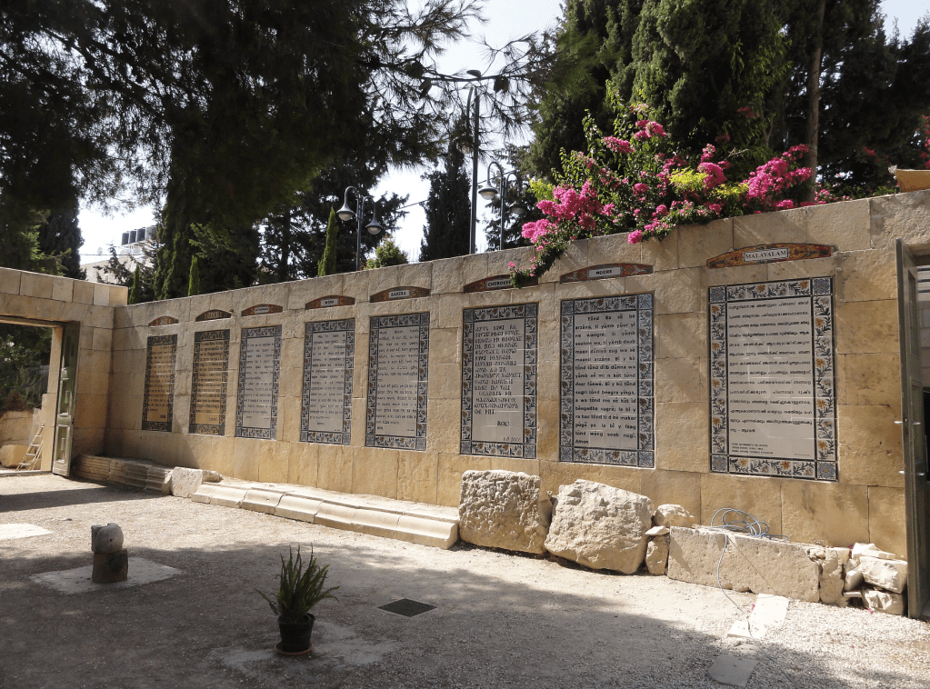 At the Church of the Pater Noster in Jerusalem stood another reminder. A French Carmelite cloister built in the 1800s and early 1900s on the site of a fourth-century Byzantine church, it features plaques on the cloister wall showing the Our Father or Lord’s Prayer in more than a hundred modern and ancient languages. I even recognized one in Cherokee.