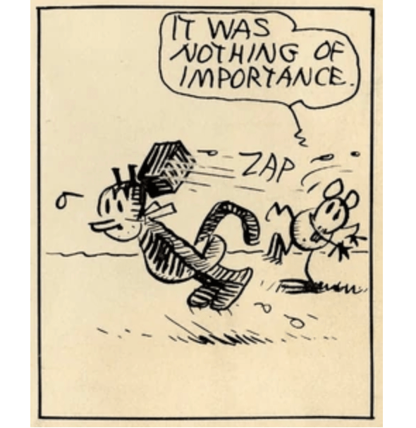 I don’t know enough about algorithms, or the psychology behind them, to have an informed opinion on how they interact with the “classic addiction loop.” But I do have some ideas about what it’s like to throw brickbats — or bricks — online. Not from psychology. Nor from scripture! But from Krazy Kat, an iconic comic strip of the 1920s and 30s that featured a lovable, goofy cat who kept getting hit with bricks thrown by a mouse named Ignatz. (Full disclosure: I identify with the cat.)