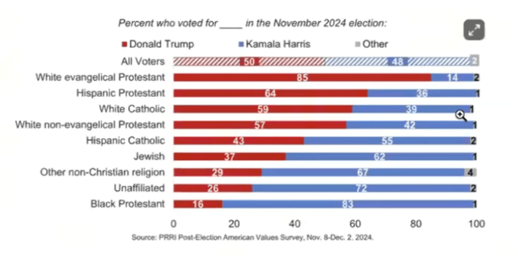 But they don’t speak for all Christians, as the cross tabs in the PRRI survey indicate. Hispanic Protestants, who tend to belong to charismatic, Pentecostal churches, went for Trump 64 percent to 36 percent; Hispanic Catholics, only 43 percent to 55 percent who voted for Democrat Kamala Harris (2 percent voted for other candidates). Most tellingly, 85 percent of white evangelical Protestants backed Trump while only 16 percent of Black Protestants did. Clearly multiple factors, including race, influenced the vote.