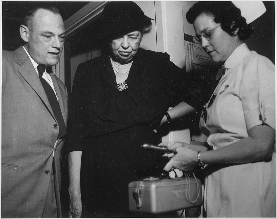 Fr. Pollard and Eleanor Roosevelt inspect radiation counter at ORINS, 1955 (Wikipedia).