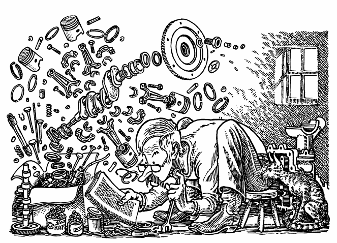 But I’m kind of a bookish guy. That’s why I like the Peter Aschwanden drawing in the header so much — I can relate to that little guy with all the car parts flying around and his nose stuck in the shop manual. It’s also why I’ve signed on with a spiritual director, a wonderfully patient Dominican sister, to help me get my head out of the books.